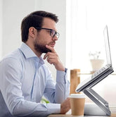Work smarter and more comfortably with this Adjustable Aluminum Laptop Stand featuring built-in dual cooling fans. Designed for ergonomic support, it helps improve posture, reduce neck strain, and keep your laptop cool during long hours of use. Its sturdy, foldable structure makes it perfect for home, office, or on-the-go productivity.
