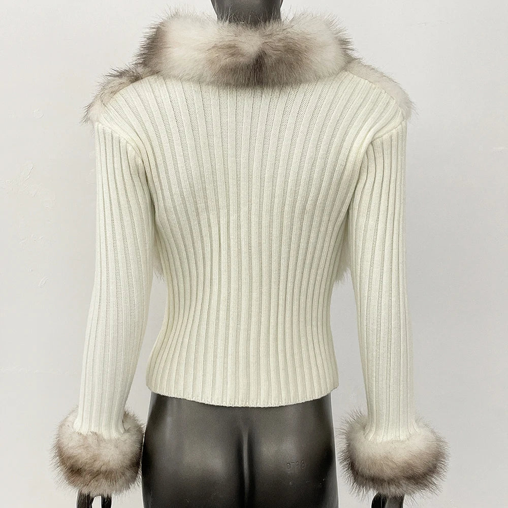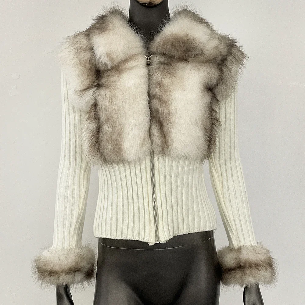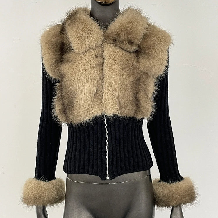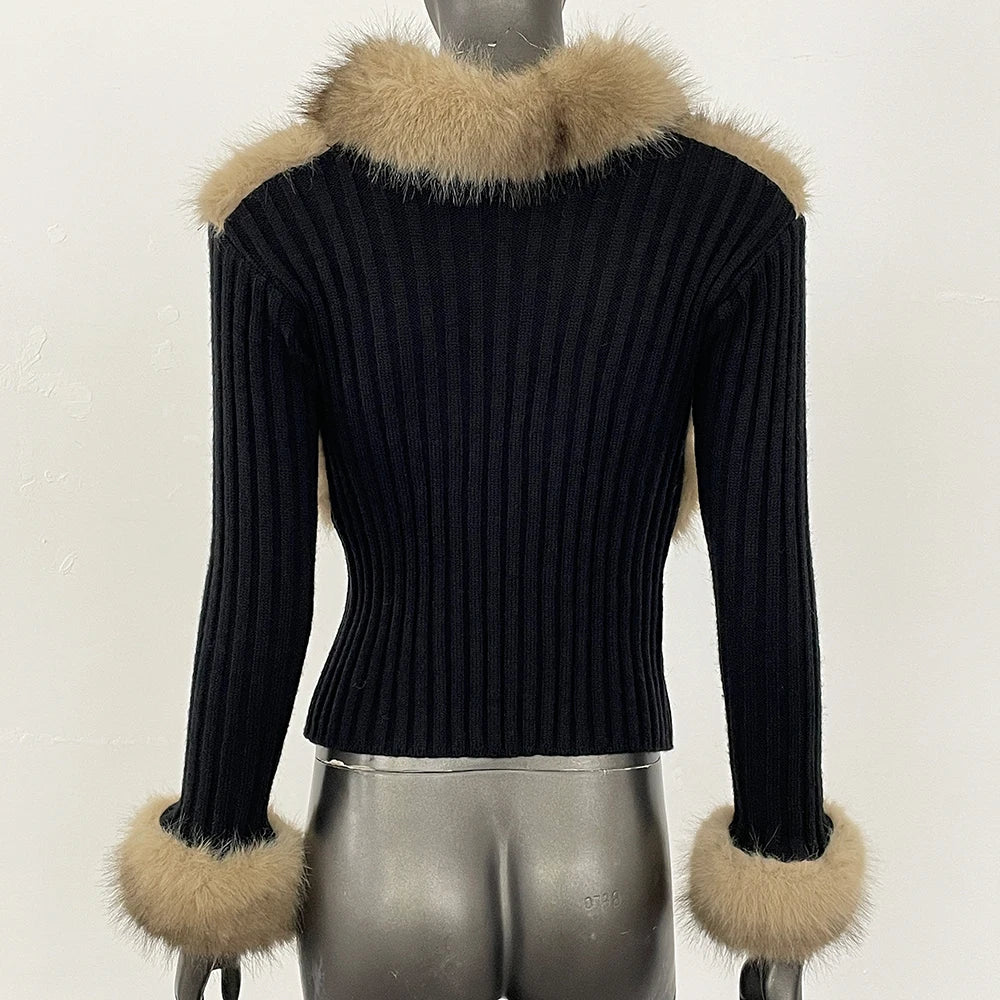 2025 Eco-friendly Sweater Cardigan Women Faux Fur Collar Knitwear Cuddly Designer Knitted Autumn Warm Faux Fur Patchwork Clothe