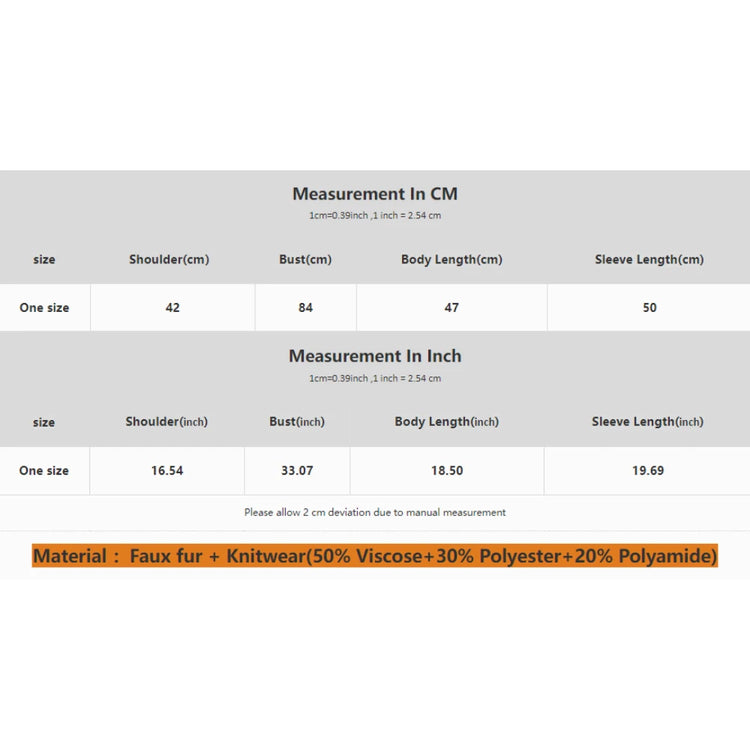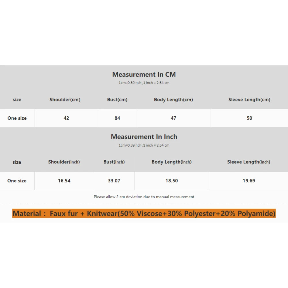 Material :Faux fur + Knitwear(50% Viscose+30% Polyester+20% Polyamide)