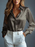 Women's Satin Shirts Elegant Plain Long Sleeve Blouse Office Lady Button-Up Shirt Top Female Crew Neck Shirts Blouse 2025 Autumn